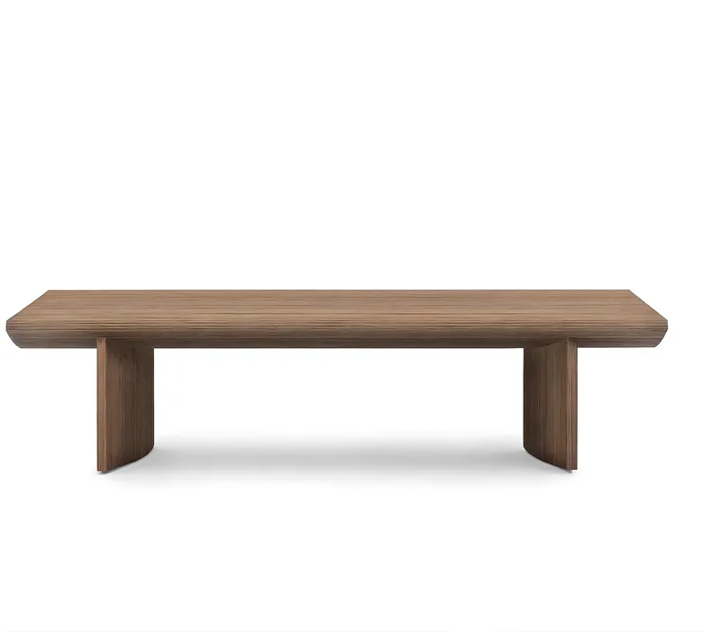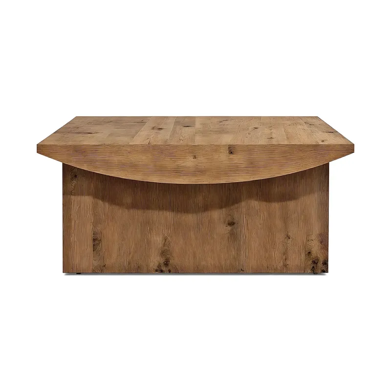 Crescent is a modern coffee table with a graceful curved edge that brings a quiet sense of movement to the living room. The solid wood top is shaped with a soft radius and finished to a smooth matte sheen that invites touch. This curve eases traffic around the piece and visually lightens the center of the room while the broad surface provides dependable space for books trays and relaxed meals. The design keeps details minimal so the eye rests on the gentle arc and natural grain.